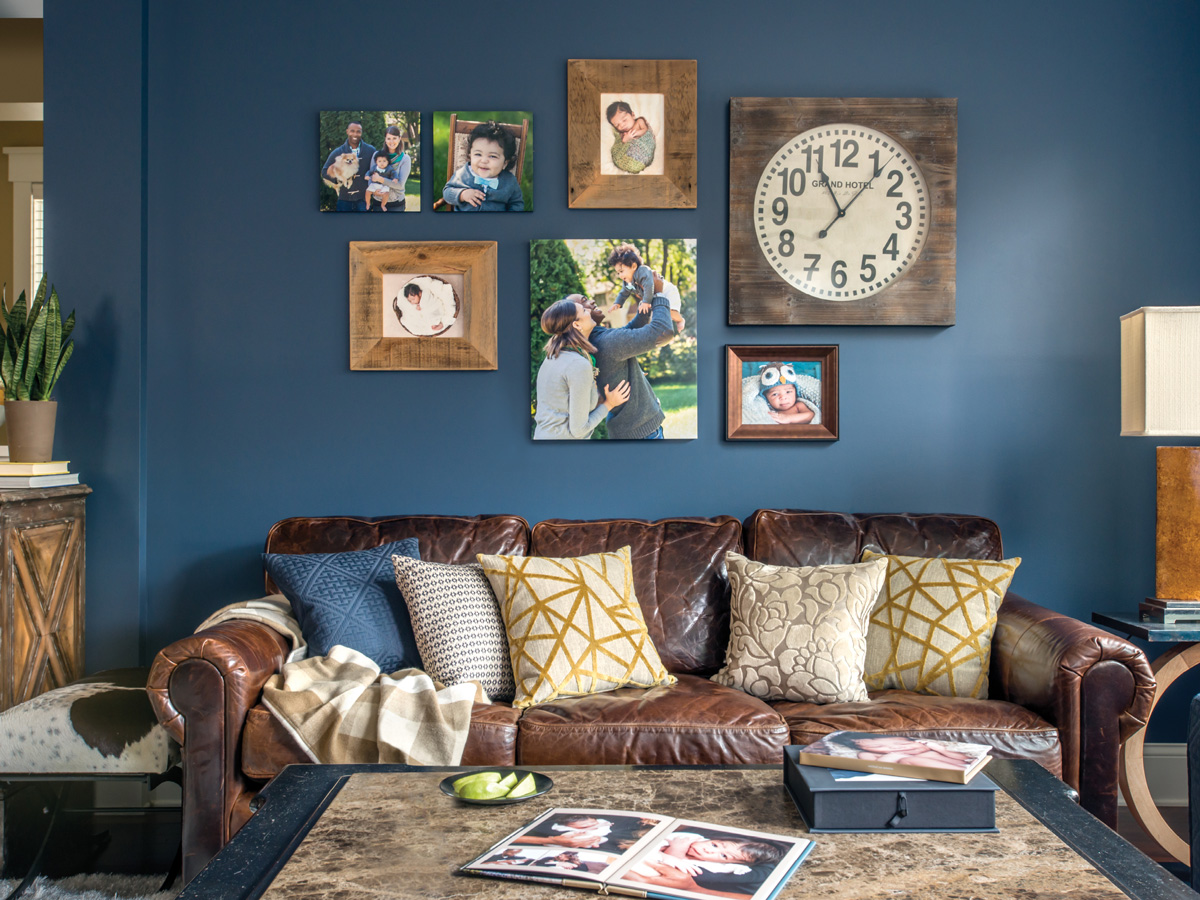 Breathe new life into your living space! Blend custom family imagery and existing décor with expressive wall displays. Coffee table books and other tabletop displays help pull together the style of the room.