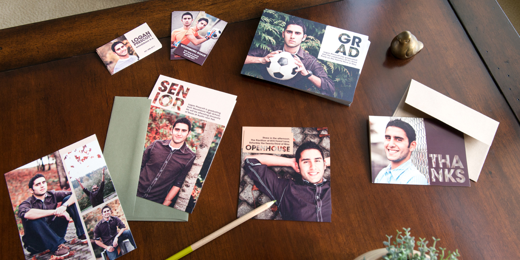 Whether you’re celebrating with a graduation party or simply proclaiming your accomplishments, spread the word with customized cards. Send invitations, announcements, and thank you notes that feature your favorite senior images. Add even more personality with stylish card shapes and foil pressed designs. With options as unique as you are, create entire packages customized just for you with matching envelopes, address labels, and more. This is your moment. Express your style and individuality.